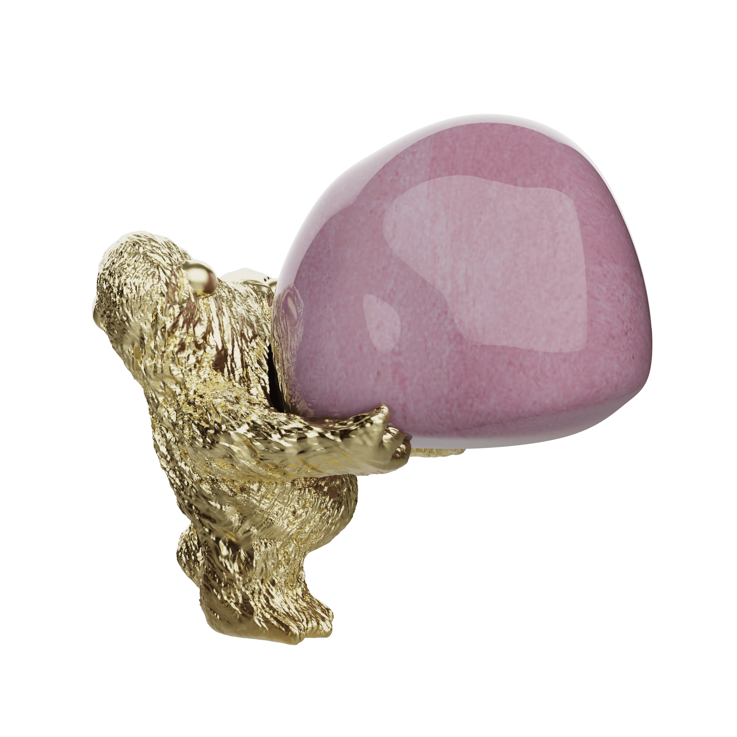 This golden beast clutching a glossy pink bubble isn’t here to blend in—it’s here to pop.